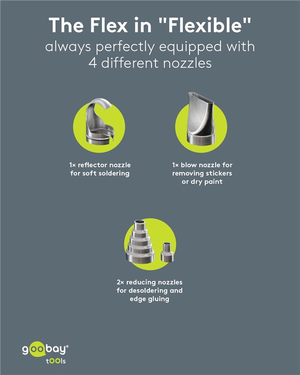 • W zestawie cztery dysze: 1x płaska dysza strumieniowa do usuwania naklejek lub zaschniętej farby, 1x łopatkowa dysza refleksyjna do miękkiego lutowania, 2x wąskie dysze redukcyjne do lutowania lub klejenia krawędzi