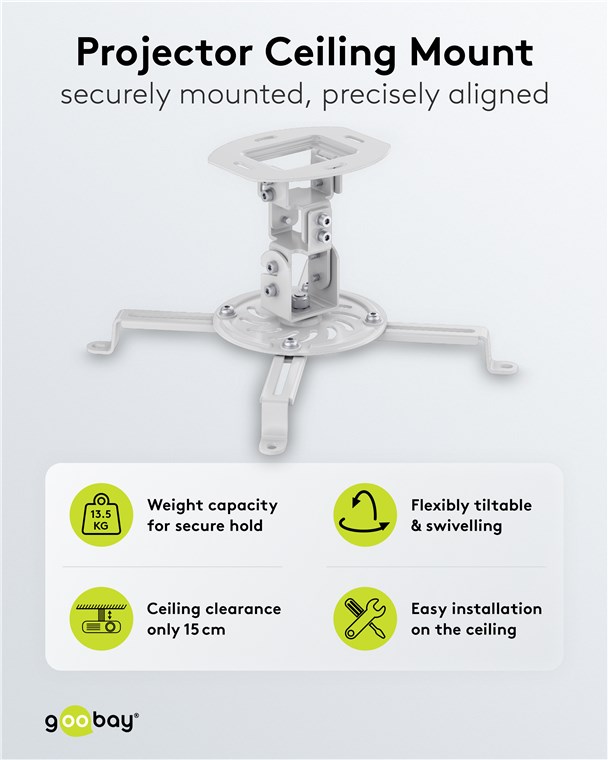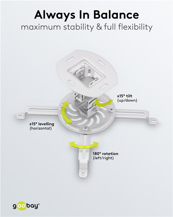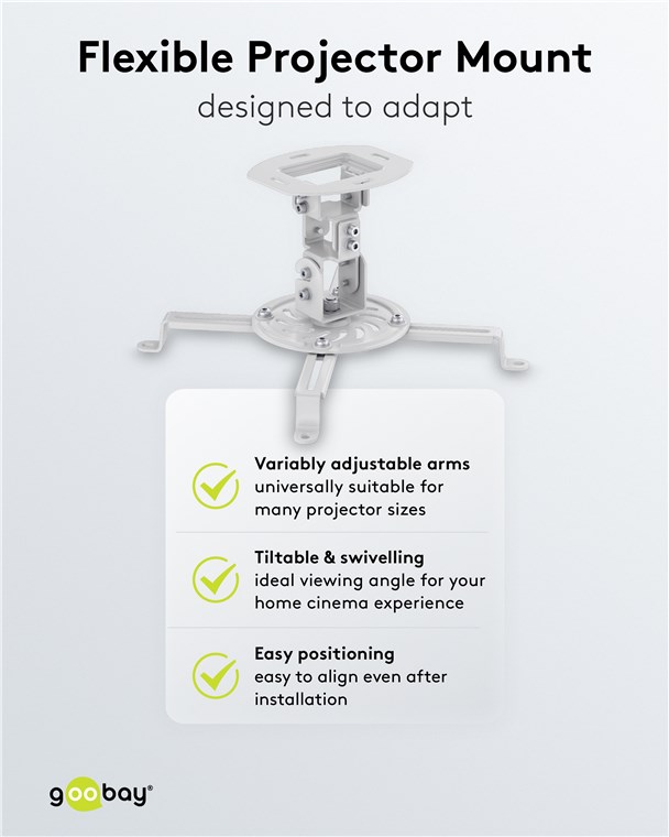 Nowoczesna równowaga między elastycznością a dyskretnym wyglądem. Niezależnie od tego, czy chodzi o relaksujący wieczór z kinem domowym w domu, czy profesjonalne prezentacje w biurze, solidny uchwyt sufitowy stanowi niezawodne wsparcie dla Twojego projektora. Dzięki elastycznemu obracaniu i pochylaniu zawsze znajdziesz idealny kąt widzenia, niezależnie od pomieszczenia lub wysokości montażu. Aby w pełni skupić się na tym, co najważniejsze.