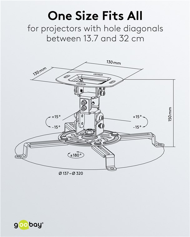 • Elastyczna szerokość: Cztery ramiona mocujące uchwytu sufitowego można płynnie przesuwać, dostosowując je do wszystkich rozstawów otworów między 13,7 a 32 cm